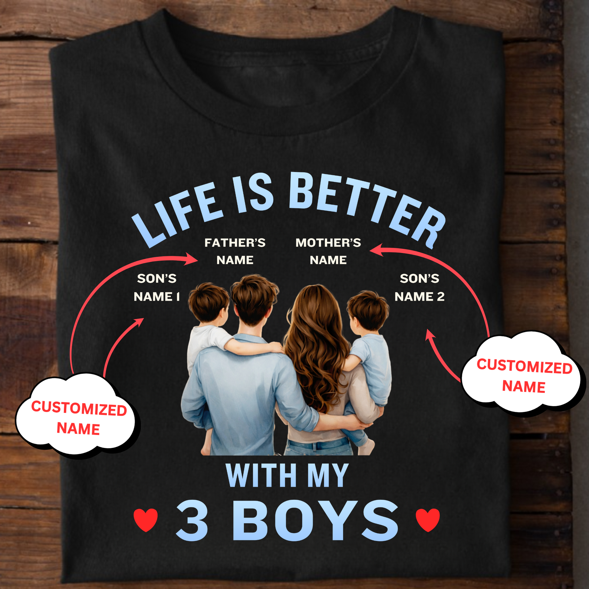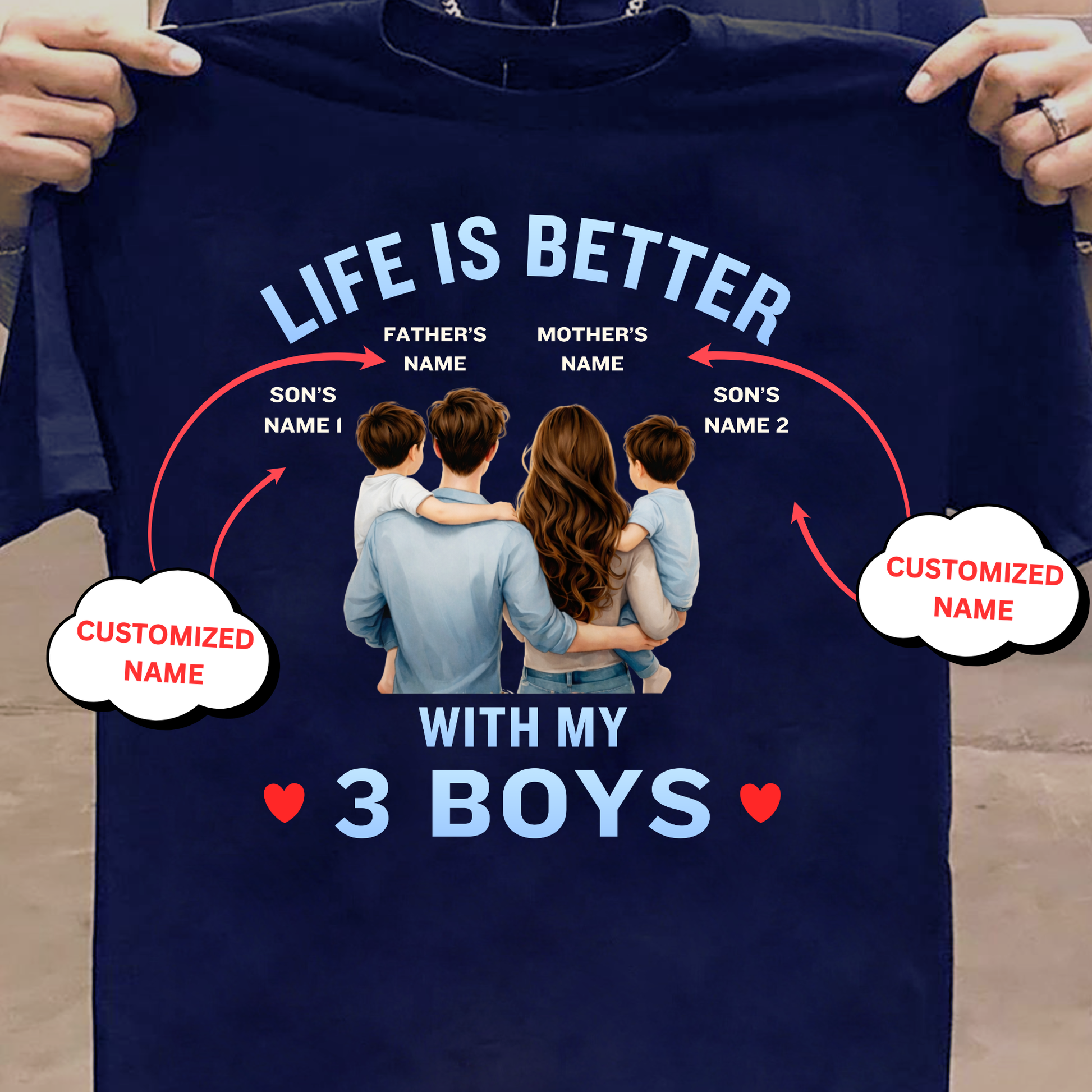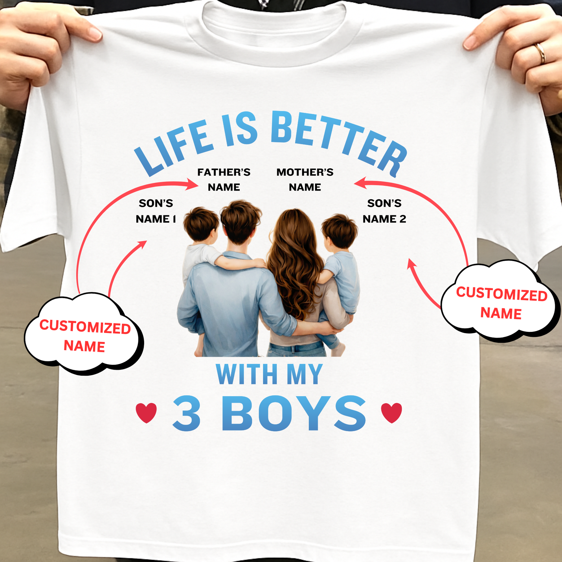 CUSTOMIZED-LIFE IS BETTER WITH MY 3 BOYS (FATHER & MOTHER WITH 2 SONS) CLASSIC T-SHIRT